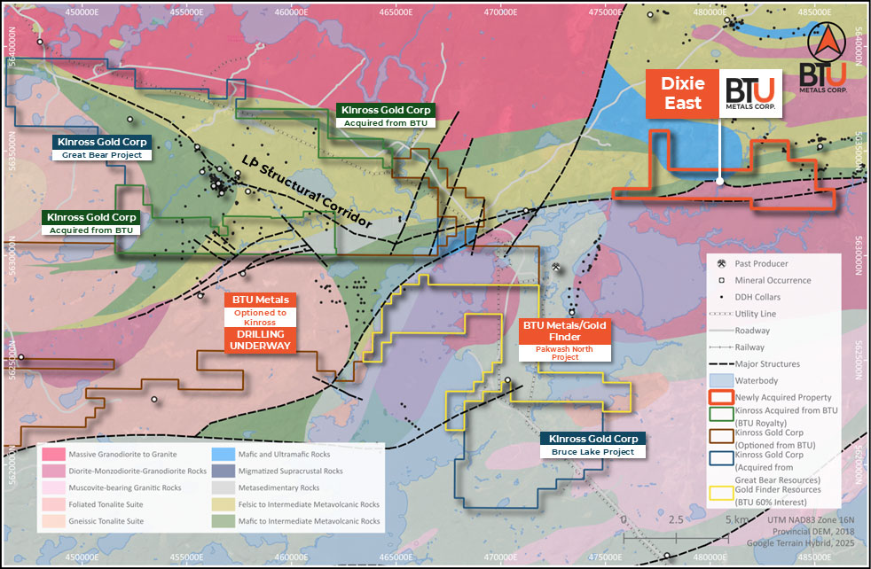 The Dixie East Project is located 5.5 kilometres east of Kinross’ world-class Great Bear Dixie deposit, southeast of Red Lake, Ontario. BTU Metals has acquired a 100% interest in this significant new land package, which positions the Company directly along the eastern extension of structural trends that host the Great Bear discovery. The project remains virtually unexplored for LP Fault style gold mineralization and provides BTU with a compelling new exploration opportunity in one of Canada’s most active gold districts.